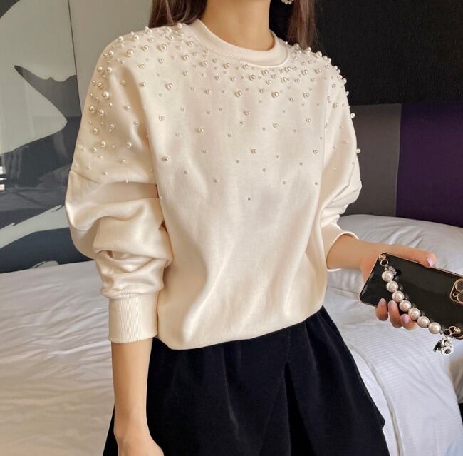 全2色 スウェット トレーナー 切り替え 体型カバー 着痩せ ビジュー付き シンプル カジュアル