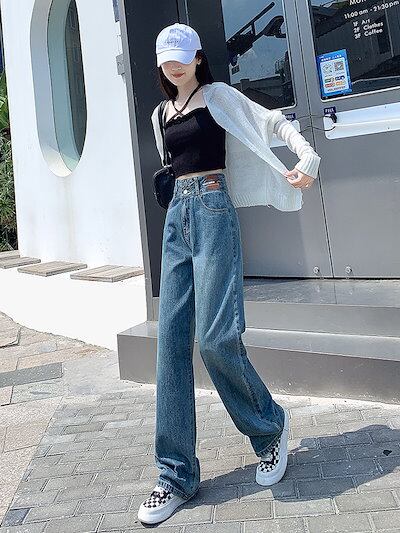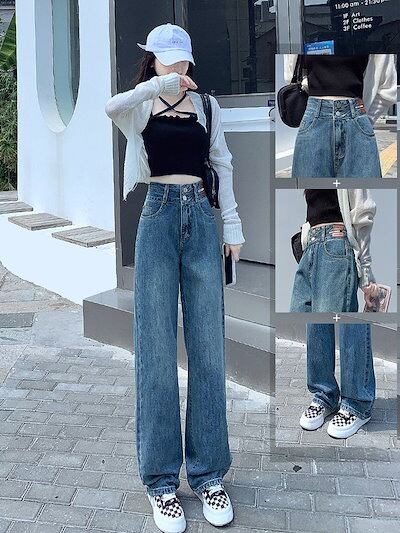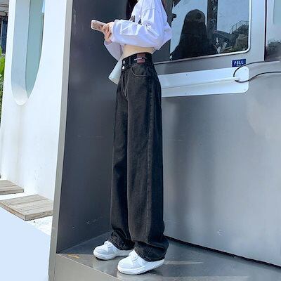 脚長効果!スキニーパンツ デニムボトムスレトロゆったりジーンズハイウエスト韓国ファッション秋 新作 スキニーパンツ レディース ワイドパンツ ボトムス