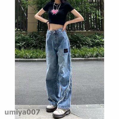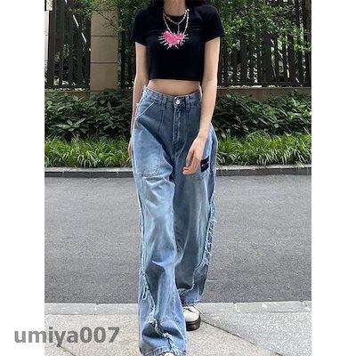 デニムパンツ レディース ワイドパンツ 切りっぱなし 着痩せ カジュアル ジーンズ ロング丈 オシャレ ストレート ハイウエスト 体型カバー 新作 コーデ