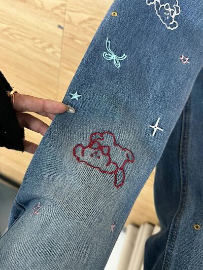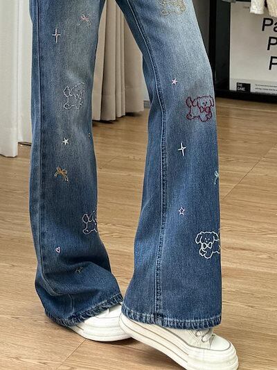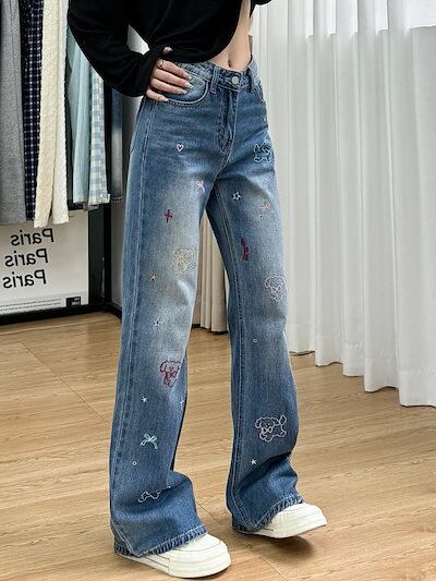 デニムパンツ カートゥーン刺繍ハイウエストワイドパンツレディース2025春新作アメリカンレトロストレートパンツモップロングパンツ