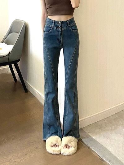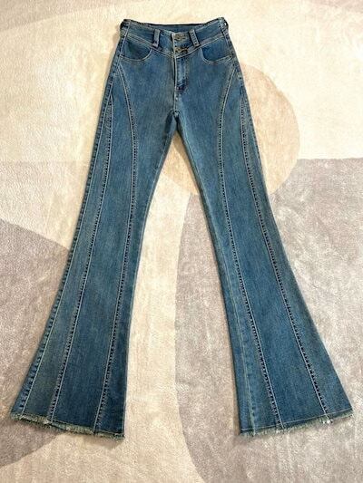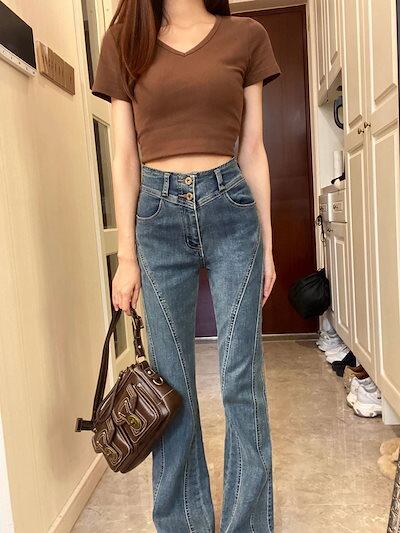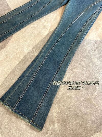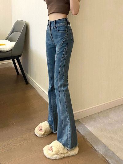 デニムパンツ ハイウエストフリルマイクロフレアジーンズレディース春秋2025年新作フィットレトロストレッチフレアロングパンツファッション