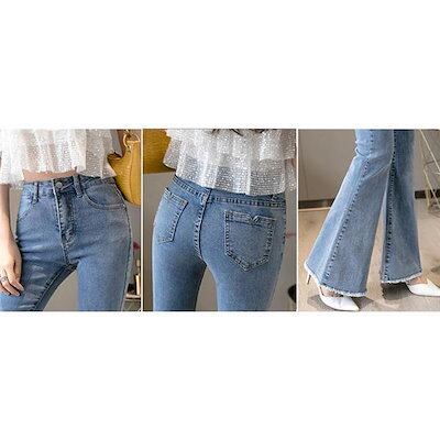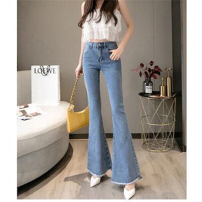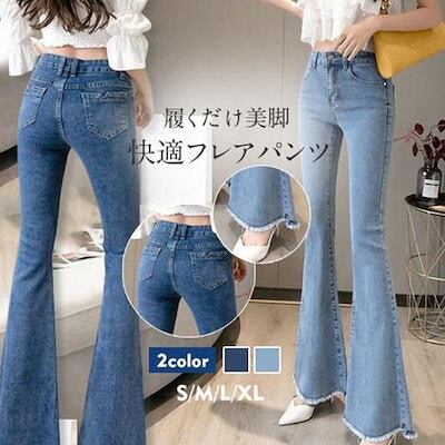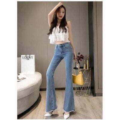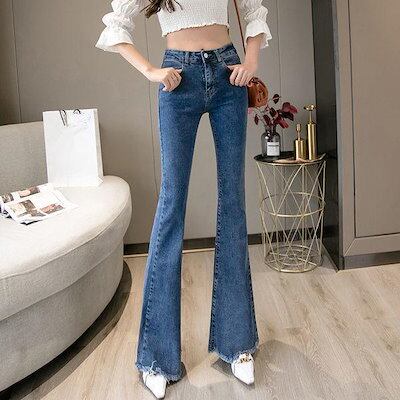 (wusu0bici)迅速な出荷フレアパンツ デニムパンツ レディース ハイウエスト ポケット付き 裾フリンジ 脚長効果 美脚 スリム ロングパンツ デニムズボン ベルボト 新作