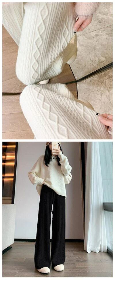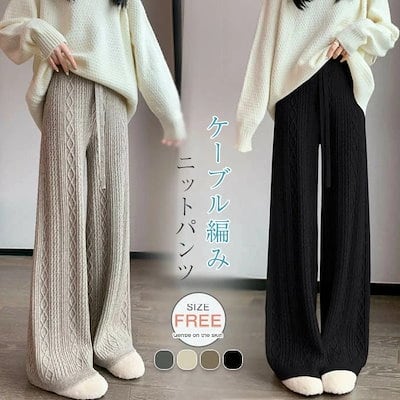 ニットパンツ 秋冬 ワイドパンツ レディース ロングパンツ ケーブルニット ウエストゴム 美脚 リラックス 暖い カジュアル ボトムス ケーブル編み ニットパンツ バギーパンツ イージーパンツ ゆった