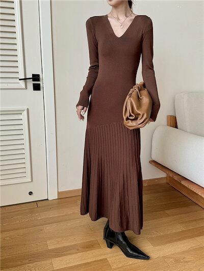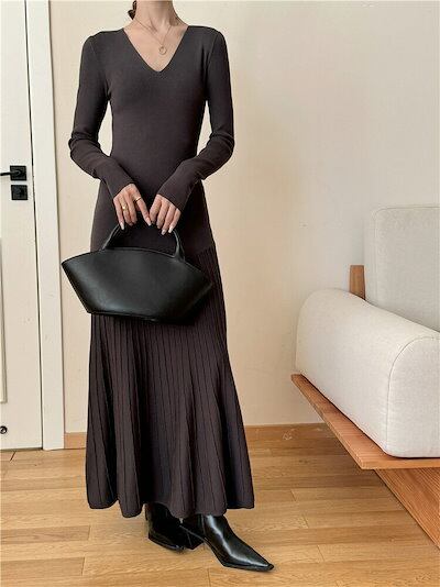 ニットワンピース レディース きれいめ カジュアル 秋 冬 秋冬 ロング 長袖 韓国 Aライン インナー vネック マーメイド ニットワンピ フレア タイト プリーツ切替