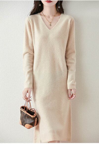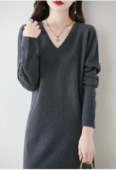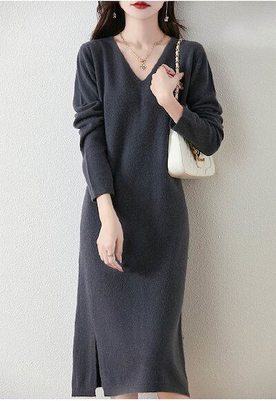 ニットワンピース Vネック ワンピース 長袖 ニットワンピース 春 秋 冬 ニット チュニック ロング丈 レディース 長袖 ニットワンピース ゆったり シンプル カジュアル