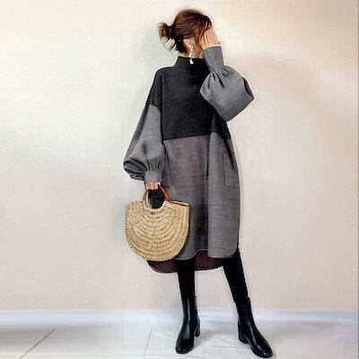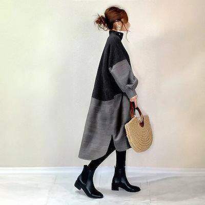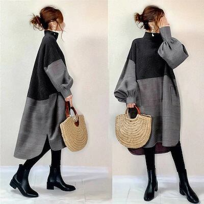 ワンピース ドッキングワンピース レディース ドルマンスリーブ ぽワン袖 秋冬 アシンメトリー ロング ワンピース タートルネックハイネック 配色 バイカラー 秋 冬 長袖
