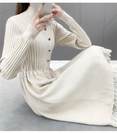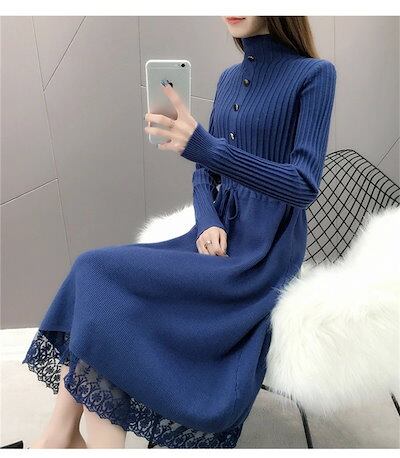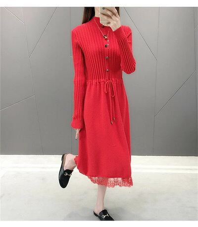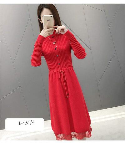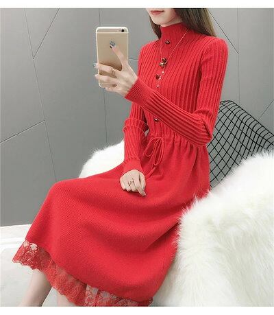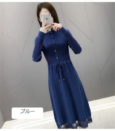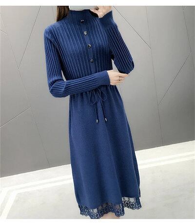 ニットワンピース レディース ロングワンピース ミモレ丈 長袖 セーターワンピース トップス プチハイネック レース付き 秋冬 Aライン 体型カバー 無地 カジュアル シンプル ファション コーデ 大