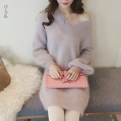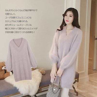 ニットワンピース ミニ丈 Vネック レディース チュニック 秋冬 ニットワンピ ワンピース トップス ミンクカシミア感 パフスリーブ Iライン タイトワンピース ゆったり ふわふわ ストレッチ 柔ら