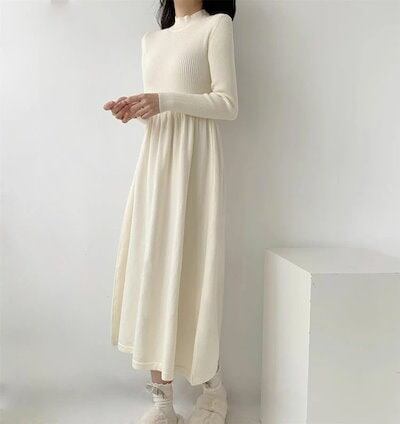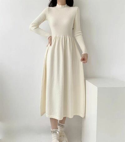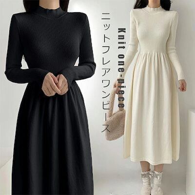 ニットワンピース 秋冬 マキシ丈 フレアワンピース レディース ロングワンピース ニット ワンピース ニットワンピ 切り替え フレア Aライン ゆったり 体型カバー 長袖 プチハイネック リブニット