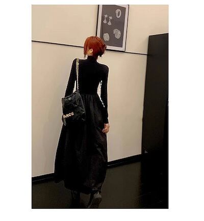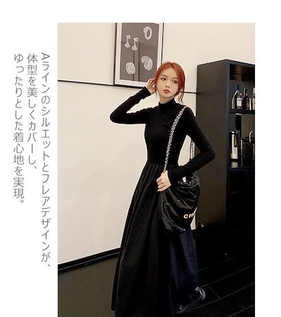 ワンピース 秋冬 長袖 レディース フレア 切り替え ロング丈 ロングワンピース ワンピース フレアワンピース 長そで プチハイネックワンピ ハイネック Aラインワンピ ゆったり 体型カバー 無地 ハ