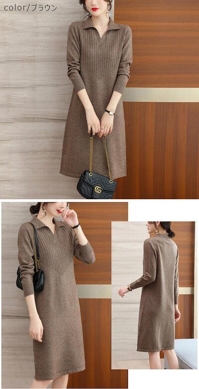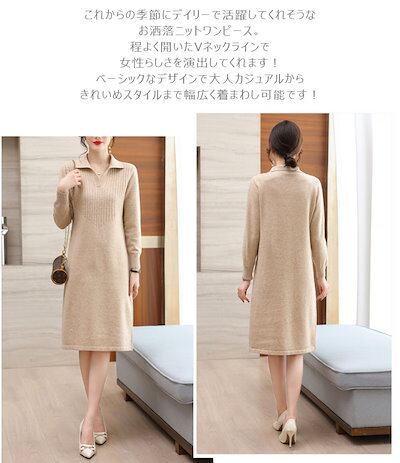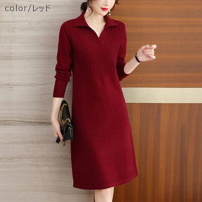 ニットワンピース Vネック レディース ニット 秋冬 春 ひざ丈 Iラインインナーワンピース 折襟 Iライン ロングワンピース ニット ゆったり 長袖 ニットワンピ インナーウエア ワンピ エレガント