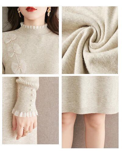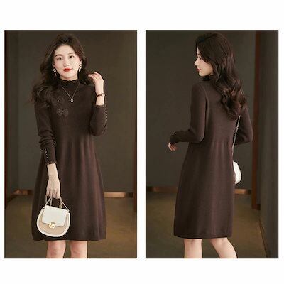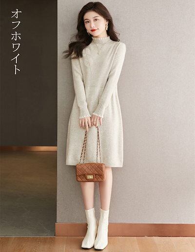 ニットワンピース チュニック レディース 膝丈 秋冬 ワンピース ハイネック ニット ロング丈 フリル 膝丈 プチハイネックワンピース 長袖 ストレッチ 無地 体型カバー オシャレ 長そで シンプル