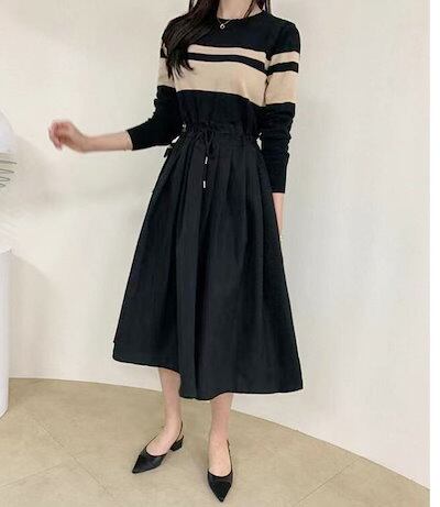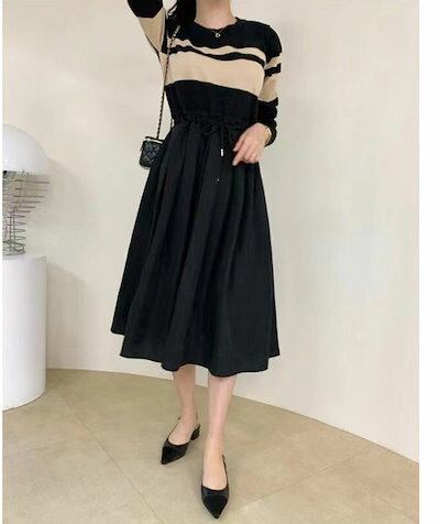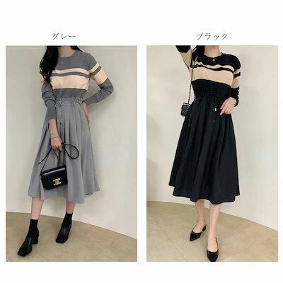 ニットワンピース 秋冬 切り替え レディース ワンピース 秋 冬 ニットワンピ きれいめ 春 大きいサイズ 長袖 ボーダー ロングワンピース ウエスト紐 着痩せ 異素材 ゆったり お洒落 通勤 着回し