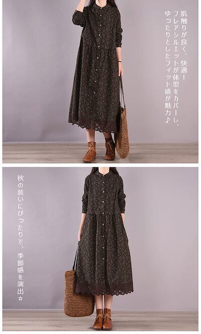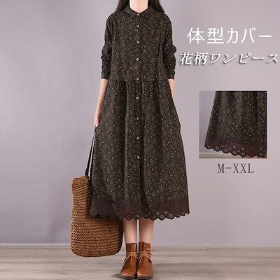 ロングワンピース 秋冬 長袖 レディース 大きいサイズ 秋 冬 シャツワンピース ワンピース 体型カバー ロングワンピ 総柄 長袖ワンピース 花柄 レース ミモレ 花柄ワンピース ゆったり ポケット付