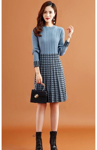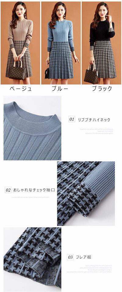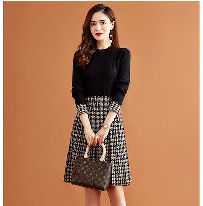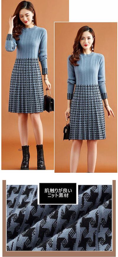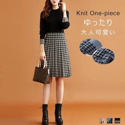 ニットワンピース チェック柄 レディース 秋冬 ニット ワンピース ひざ丈 長袖 切り替え リブニット ドッキング フレア Aライン 膝丈ワンピース ゆったり 体型カバー ニットソー フォーマル 通勤
