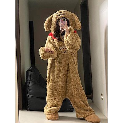 着ぐるみパジャマ 可愛いライン犬柄コーラルフリースワンピースパジャマ秋冬 レディース フード付き厚手保温ホームウェアアウターとしても着用可メガ割