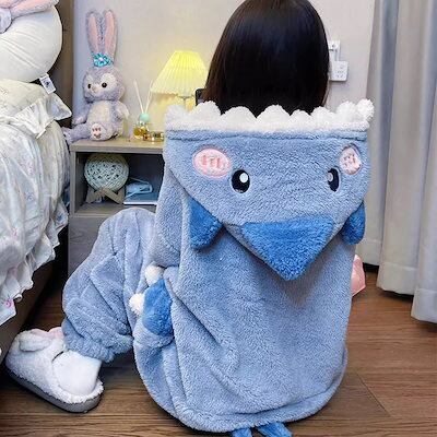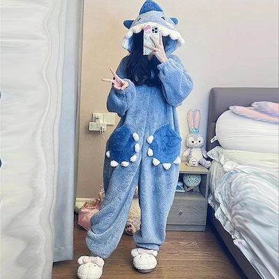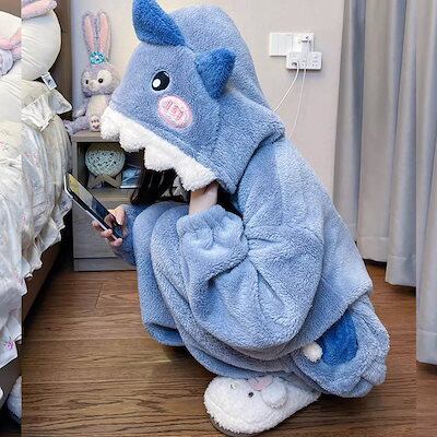 着ぐるみパジャマ 秋冬フランネルワンピースパジャマ レディース ホームウェア厚手シャークフード付きロングパイル保温カートゥーンセットメガ割