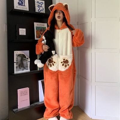 着ぐるみパジャマ フード付きパジャマ レディース秋冬用 コーラルフリース厚手 可愛いキツネ柄ワンピース ホームウェアセットメガ割