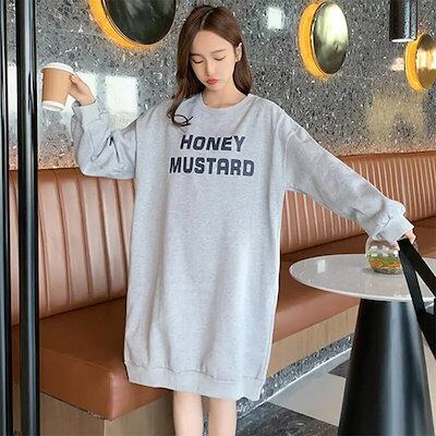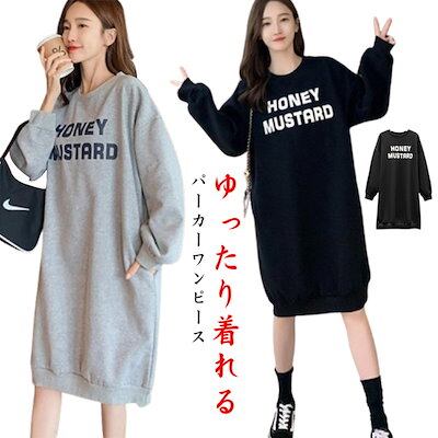 ワンピース レディース ルームウェア かわいい ロングトレーナー プルオーバー パーカー ロング丈 ルームワンピース ポケット付き クルーネック 部屋着 パジャマ 裏起毛 春 秋冬 英字ロゴ