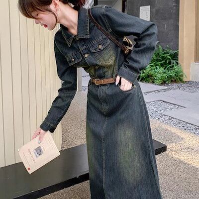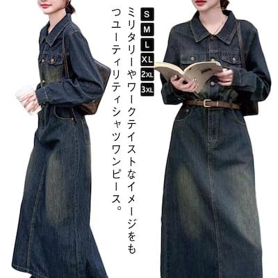 デニムワンピース 長袖 襟付き ロング ワンピース ミリタリー レディース ミリタリーワンピース デニム ロングワンピース ゆったり ウォッシュ加工 レトロ ヴィンテージ 春 秋 冬 アメカジ