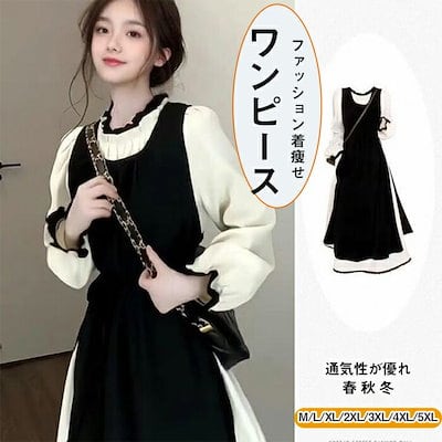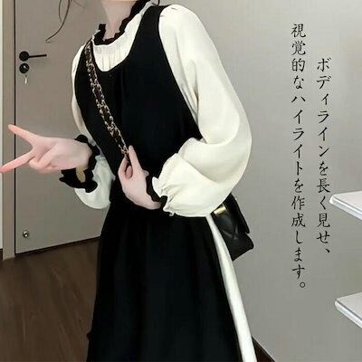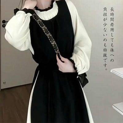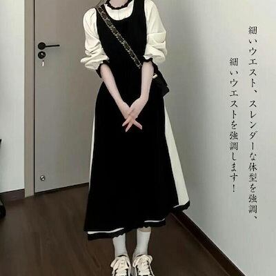 レディース ワンピース ドレス ロングワンピース ロング 切り替え 長袖 タイト ブラック クルーネック ハイウエスト Aライン 無地 レトロ きれいめ 気質 通勤 春 秋冬