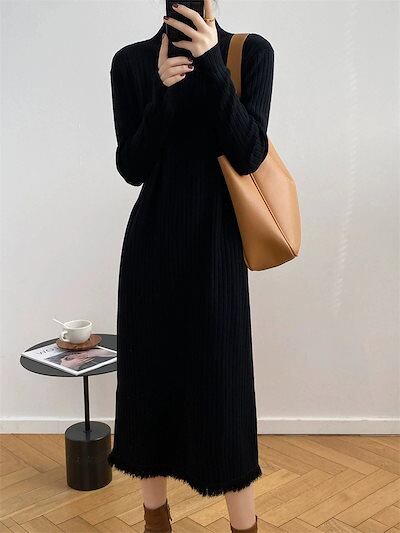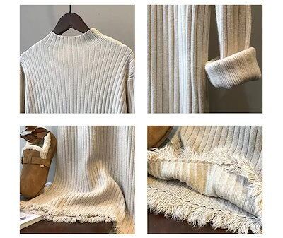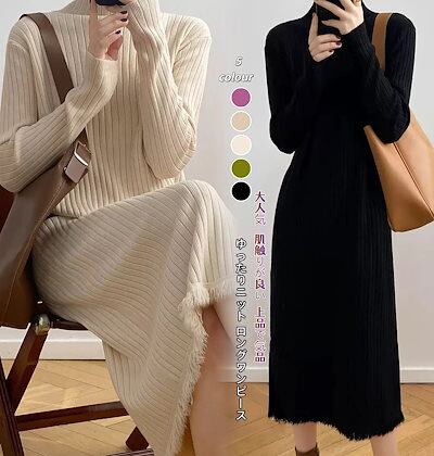 新登場! ニットワンピースレディースファッションロングワンピース 長袖 秋冬 肌触りが良いスタンドカラープリーツフリンジワンピース ニットワンピ