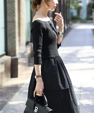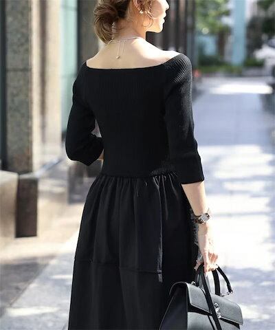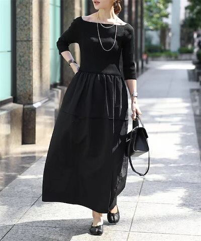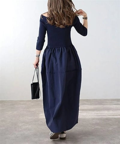 ニット ワンピース レディース 秋冬 ニットワンピース 切り替えワンピース 切り替え ボートネック ワンピ 七分袖 ロングワンピース 異素材切り替え リブニット ロング丈 マキシ Aライン 無地 ゆっ