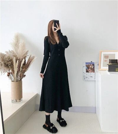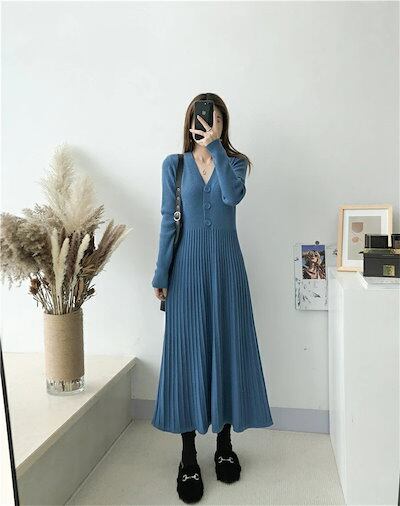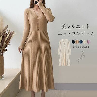 ニット ワンピース リブニット ワンピース プリーツワンピース レディース 秋 冬 Vネック ロング丈 ワンピース ニット ワンピース ロング丈 長袖 Aライン ゆったり シンプル カジュアル 体型カ