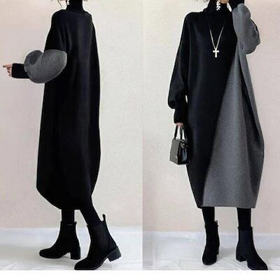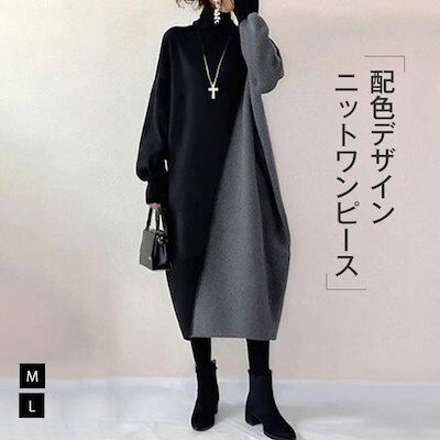 ワンピース レディース ニット ワンピース ロング ワンピース ワンピ ハイネック タートルネック 配色 バイカラー 秋 冬 長袖 体型カバー 大きいサイズ シンプル ゆったり 大きいサイズ きれいめ