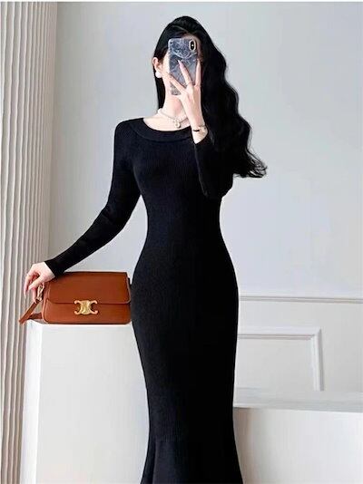 ニットワンピース ニット ワンピース マーメイド裾 レディース ロング ワンピース ロング丈 セクシー ストレッチ 伸縮性 タイト ワンピース スリム インナー ワンピース 長袖 無地 秋 冬 おしゃ