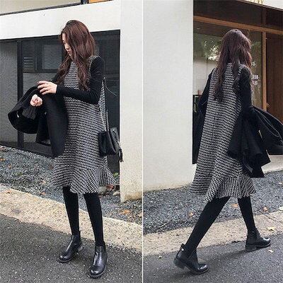 2点セット ニットワンピース レディース セットアップ スカート40代 秋 冬 チェック柄 セーター 長袖トップス 韓国風 通勤 OL オシャレ 上品 体型カバー