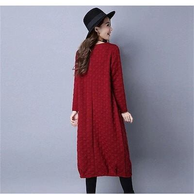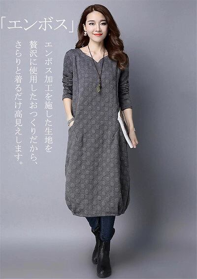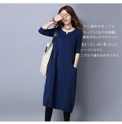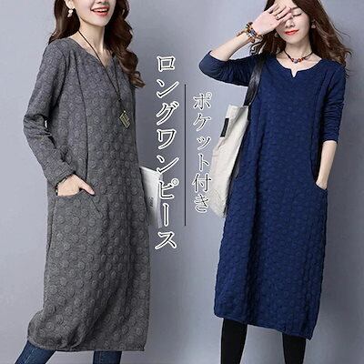 ロングワンピース レディース 秋冬 ワンピース チュニック 厚手 長袖 Vネック ミモレ丈 体型カバー ゆったり キルティング 大きいサイズ 無地 着痩せ 暖かい OL 通勤 リラックス オフェンス