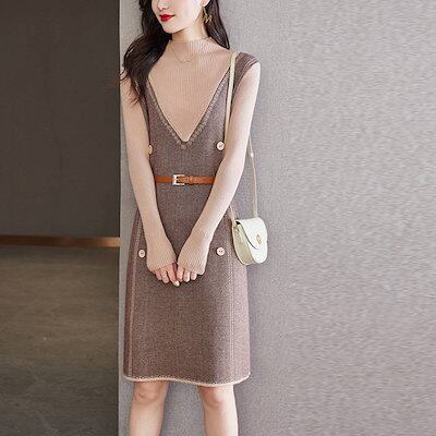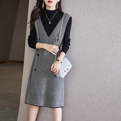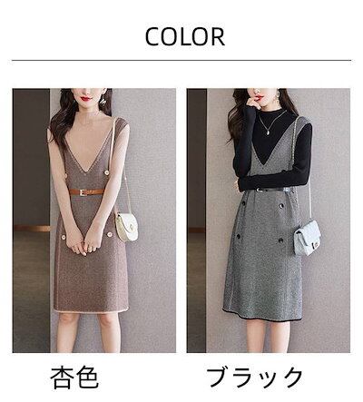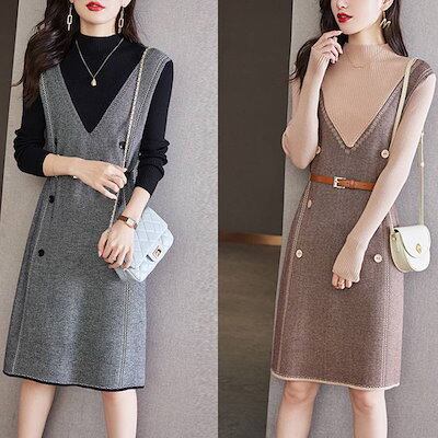 【9月新作】ニットワンピース 重ね着風 ワンピース 着痩せワンピース 膝丈 レディース ワンピース ニット ワンピース 秋冬 春 長袖