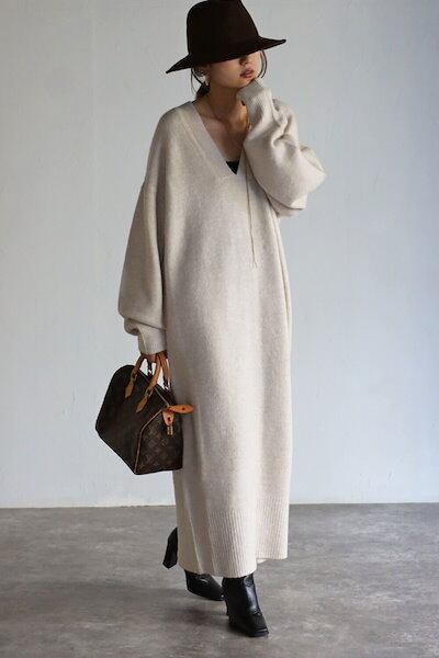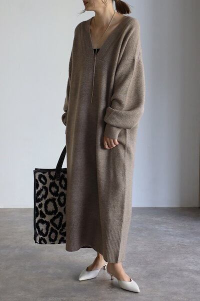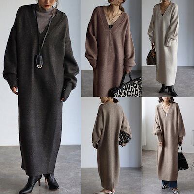 【9月新作】ニットワンピース レディース トップス 秋冬 長袖 厚手 vネック ニットワンピース 大きいサイズ ビッグシルエット