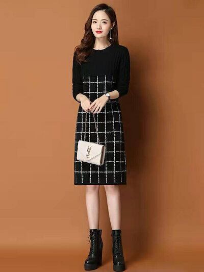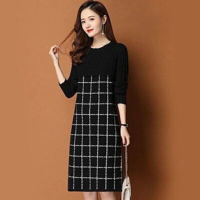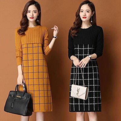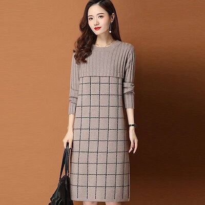 【9月新作】ニットワンピース レディース チェックワンピース ニット ワンピース 秋冬 春 長袖 ハイウエスト ゆったり
