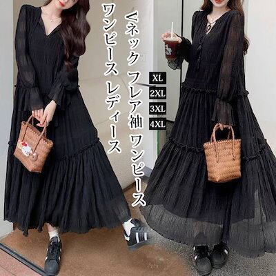 【9月新作】ワンピース レディース Vネック ロングワンピース フレア袖 ワンピース 秋冬 春 長袖 ブラック きれいめ ゆったり