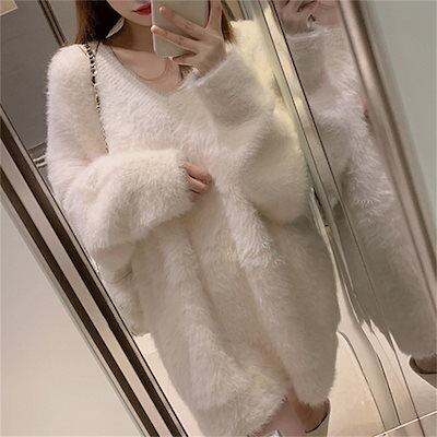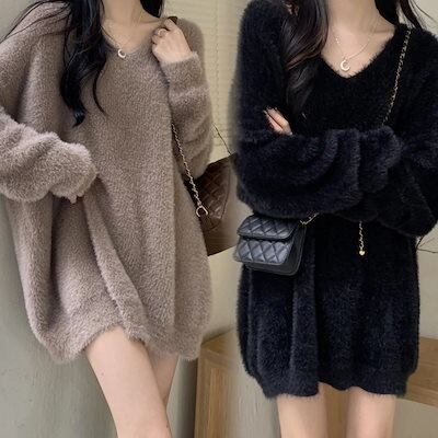 人気なリブニット 人気!もこもこ ニットトップス フェイクミンク毛 セーター レディース 韓国ファッション Vネック 着痩せ ニットセーター 甘い/気質 ゆったり 怠惰な風 大きいサイズ