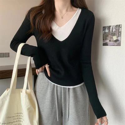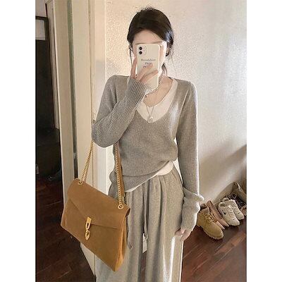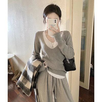 人气新作ベーシックニット韓国ファッション ニットトップス ハイネックトップス ニット ベーシックニット ゆったり フェイク2ピース Vネック ニット トップス レディース ジャンパー