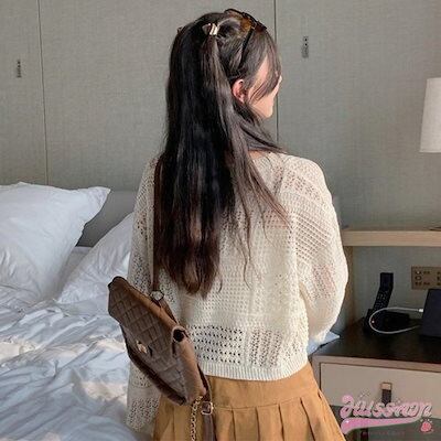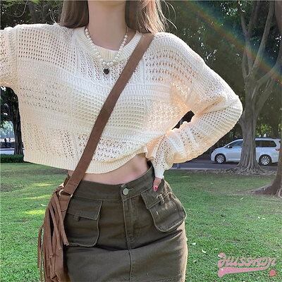 2024春夏 ニットトップス レディース長袖 韓国ファッション 可愛い ニット プルオーバー セクシー ニット ショート丈トップスおしゃれ 薄手透け感 クロシェ ニット ニッ