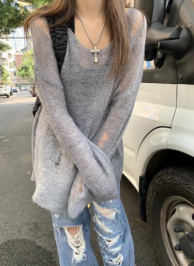 2024春夏 長袖 ニット プルトップスストリートカジュアエコルシルエットクルーネック加工色っぽ 女っぽ カジュアル 大人っぽ 上品 サイズフェミニンゆったりカジュアル レディースゆったり秋冬春