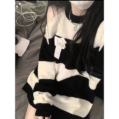 【2枚購入で 2oo円OFF!】 韓国ストライプのパッチワークカラーの肩出しセーターレディースヘッダー丸首ゆったりミディアムニット秋の新作アウター