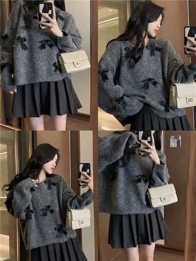 韓国ファッション 春セーター ゆったり 上質 トップス レディースリボン長袖セーターレディース 秋冬 カジュアル着やせニットアウター長袖トップス
