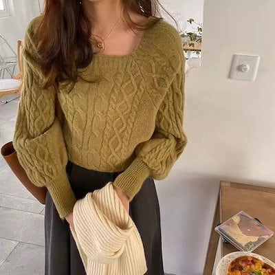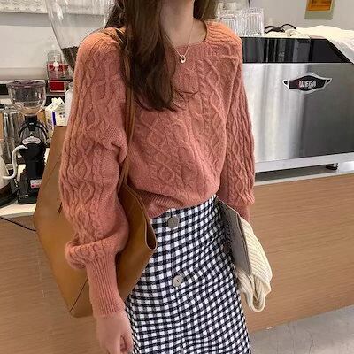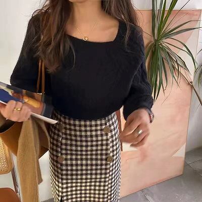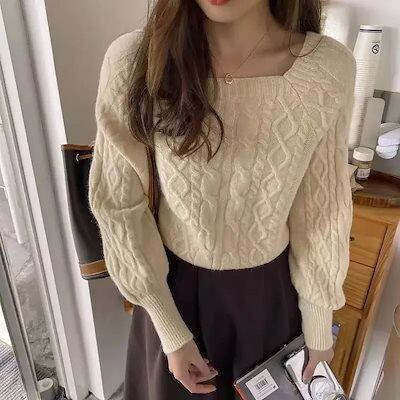 人気なリブニット ベーシックニット韓国ファッション 秋冬 ゆったりの スクエアネック セーター ショート丈 ニット 長袖カットソー