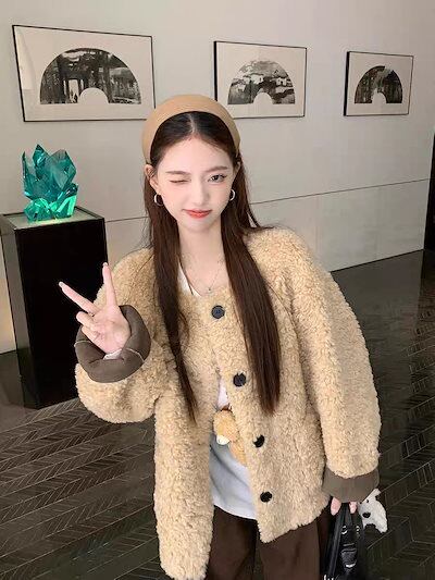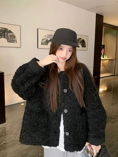 フェイクファー 優しい雰囲気の保温フリースジャケット レディースコート 2025冬 韓国 ゆるいスタイル ゆったりカジュアル ブラック ふわふわトップス ファー 毛皮アウター