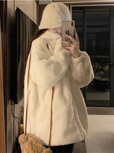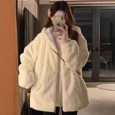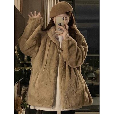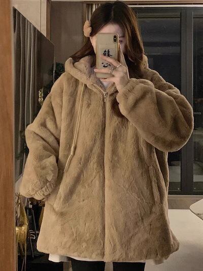 フェイクファー 韓国 ラムファーフード付き綿コートレディース 冬用厚手裏地付きゆったりラフな綿上着トレンド ファー 毛皮アウター