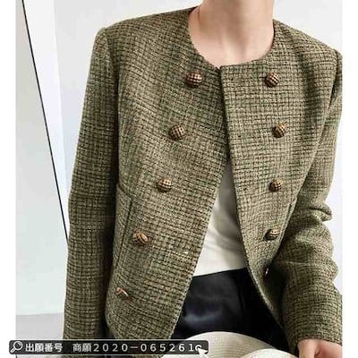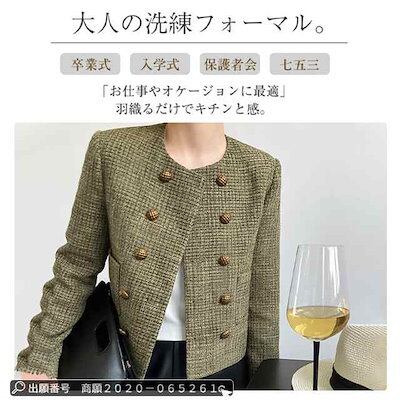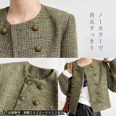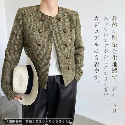 401ノーカラー ツイードジャケット レディース ジャケット ツイード アウター ノーカラ 大人 ノーカラージャケット 肩パット カーキ オフィス カジュアル ショート丈 きれいめ トップ