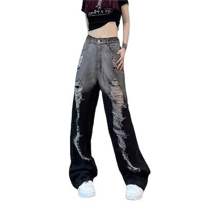 24人気新作ダメージジーンズレディース ハイウエストワイドパンツ韓国ファッション服流行りカジュアルデニムKW282