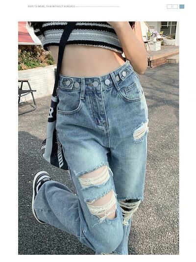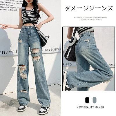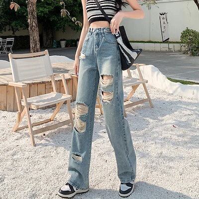 24新作 ワイドパンツ ダメージジーンズ レディース 新商品 ハイウェスト ゆったり 着痩せ デザイン感 調節可能 九分丈パンツ