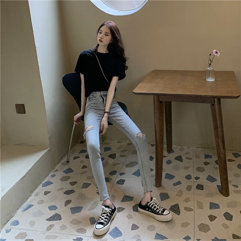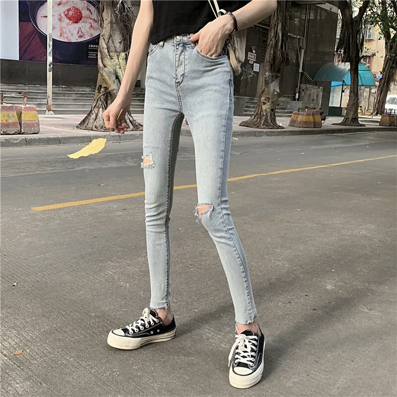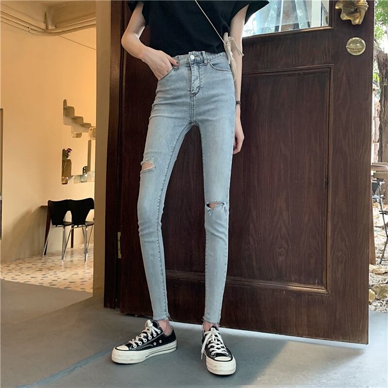【2021INS 新作】デニム 気質 個性的 設計感 ハイウエスト 破れズボン ジーンズ スリム ロングパンツ