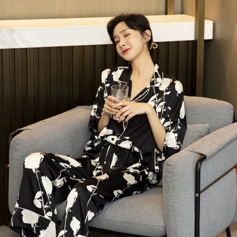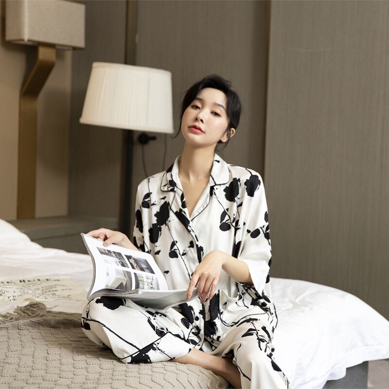 春と夏、アイスシルクのパジャマ、スーツ、ズボン、黒と白のバラ、家庭服